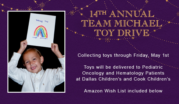In memory of Michael Malone, on his 21st Birthday in June, Team Michael and Children’s Cancer Fund present the 14th Annual Team Michael Toy Drive, benefiting the oncology and hematology patients at Dallas Children’s and Cook Children’s.